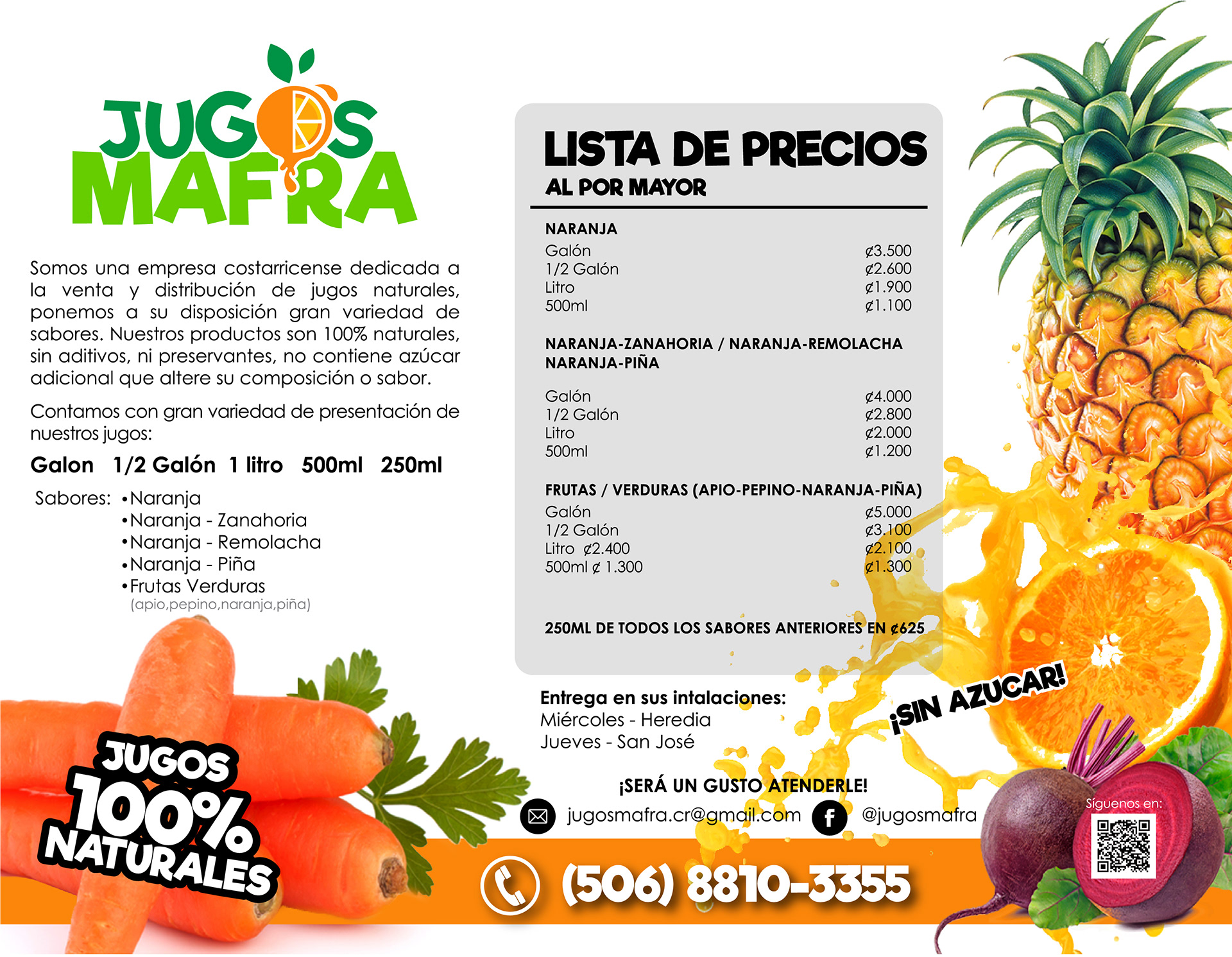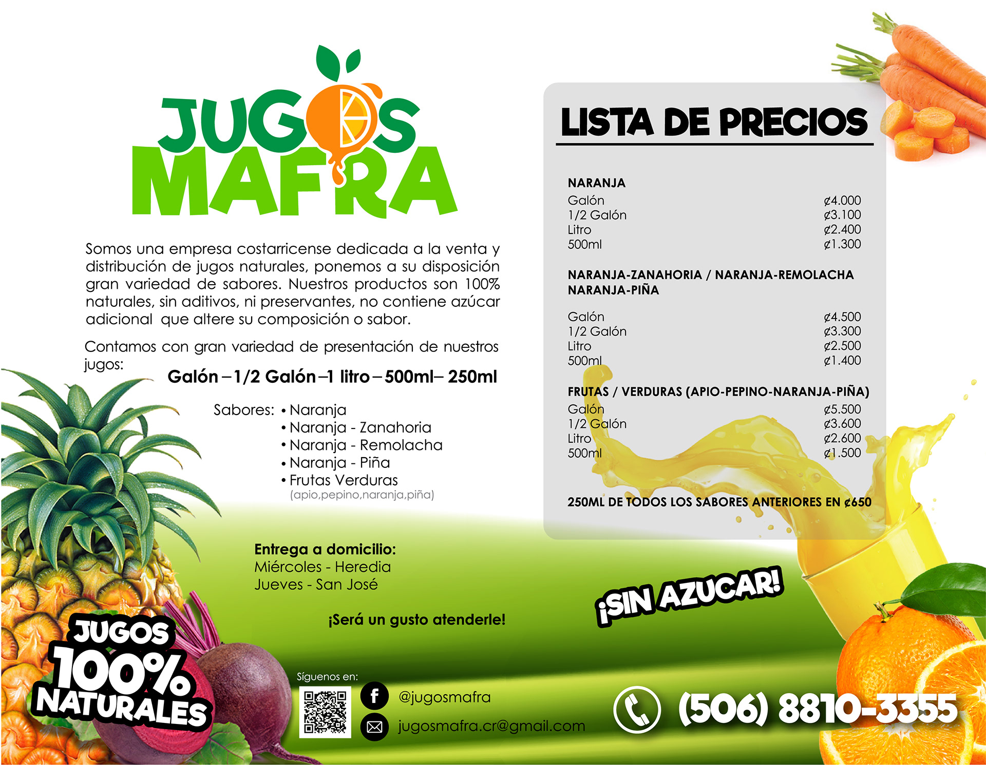 Jugos Magra — Proyecto de emprendimiento para el cual fui contratado para desarrollar el diseño del logotipo y diversas piezas gráficas para redes sociales, incluyendo lista de precios. La línea visual se trabajó con un enfoque en comunicar frescura, energía y una estética atractiva para el público objetivo.