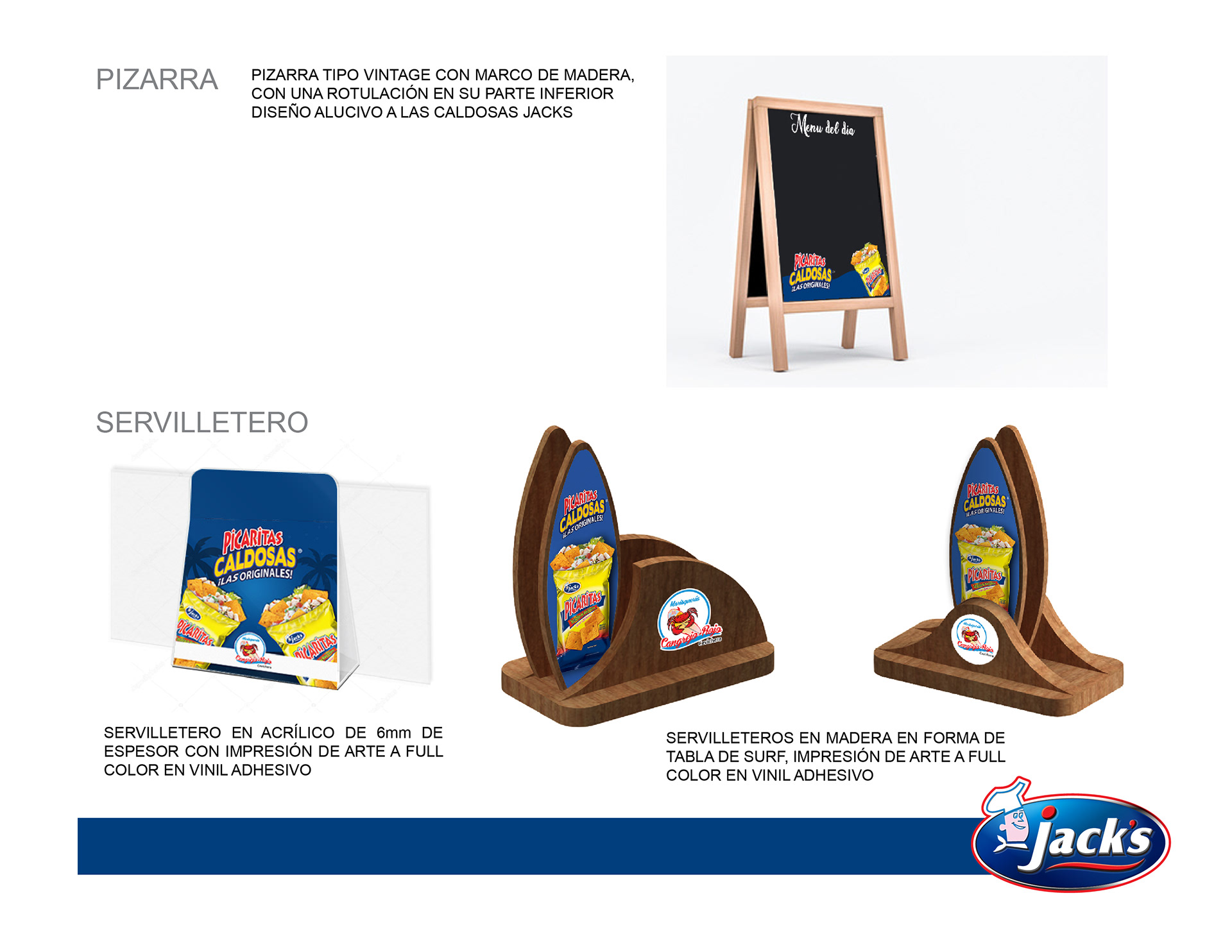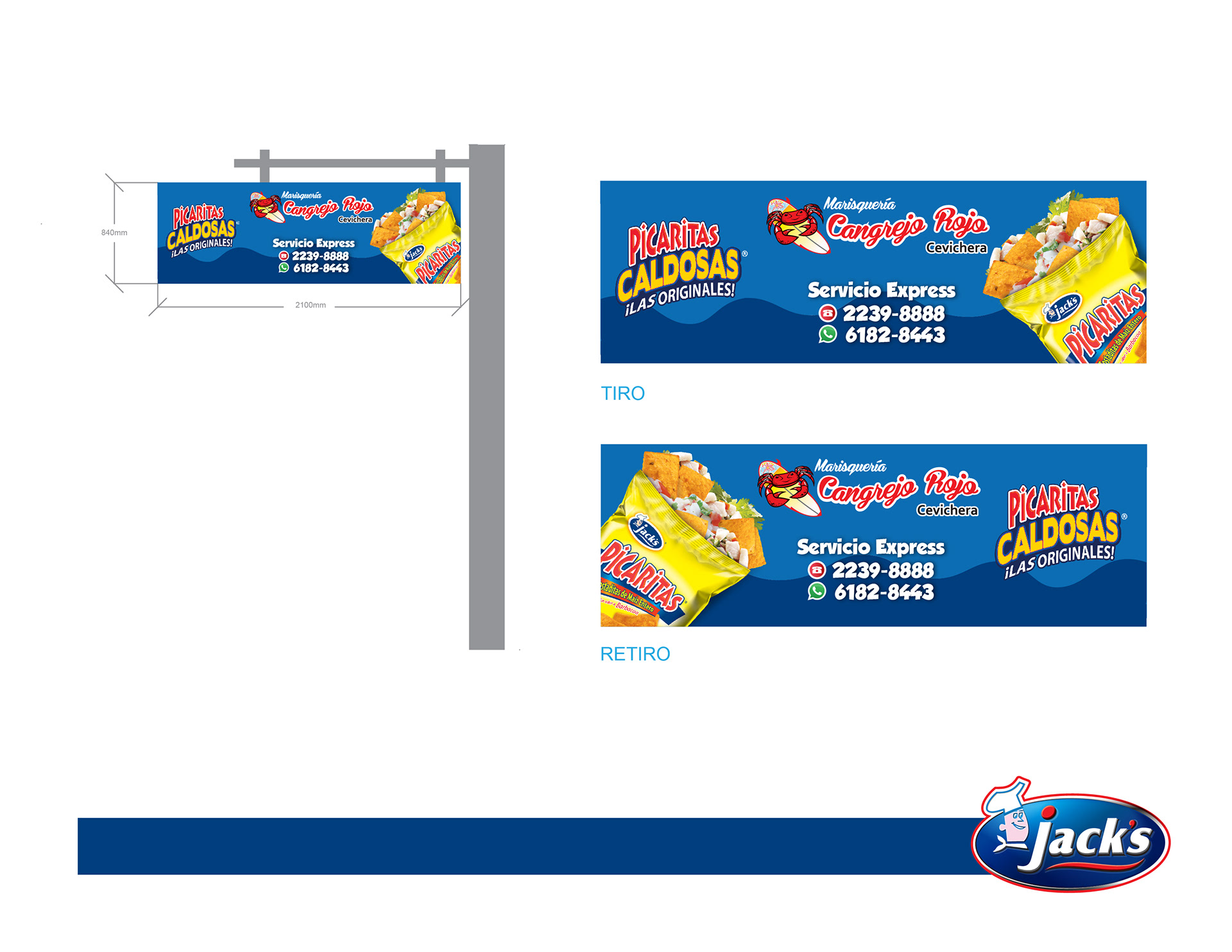 Proyecto para Alimentos Jack’s: participé en proyectos de rotulación para restaurantes y comercios apoyados por la marca, con el objetivo de mejorar su presentación al público. En este caso, desarrollé la propuesta de rotulación principal del restaurante, el diseño de un rótulo colgante para acera, servilleteros personalizados y una pizarra informativa. El proyecto me permitió crear soluciones gráficas funcionales y atractivas, orientadas a fortalecer la imagen del negocio y su comunicación visual con los clientes.